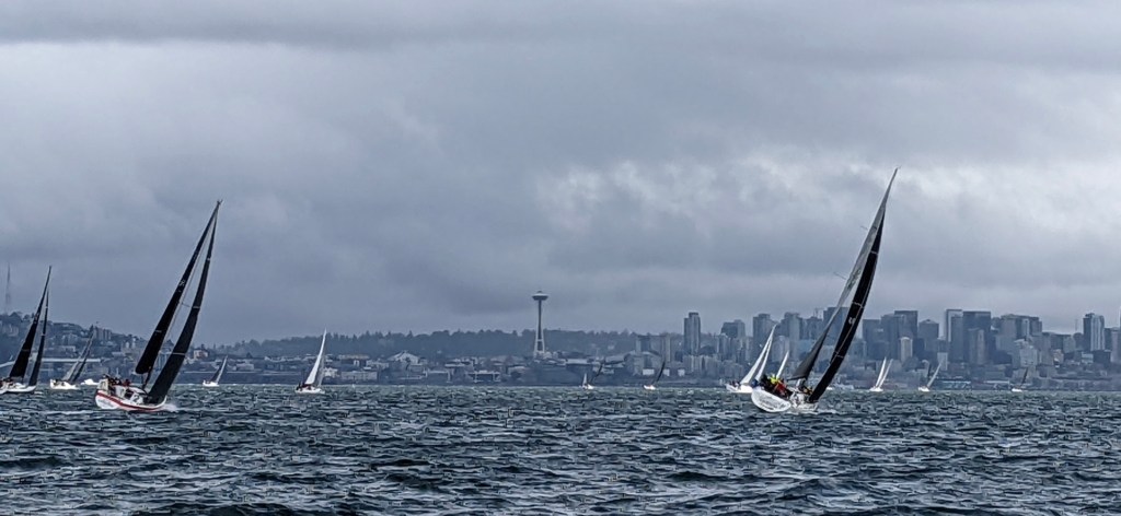 By the time we rounded the mark, we were pretty much back of the fleet. Getting over to the Duawamish Head mark, normally an easy reach, turned into an uphill slog in what was about a 20 knot easterly. We were pretty badly overpowered with the big #1 jib, but I was able to keep the boat mostly on it’s feet all the way across (with the occasional spin out). We lost a lot of ground on that tack, but we finally made it over to the mark. It took us a couple of tries to make it around (the wind was really honking, and we were overpowered and underweight), but we finally made it. This put us on another reach back to West Point, and ultimately the finish line.