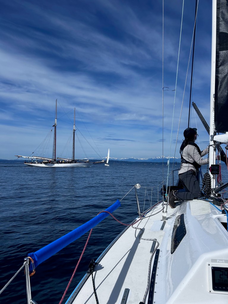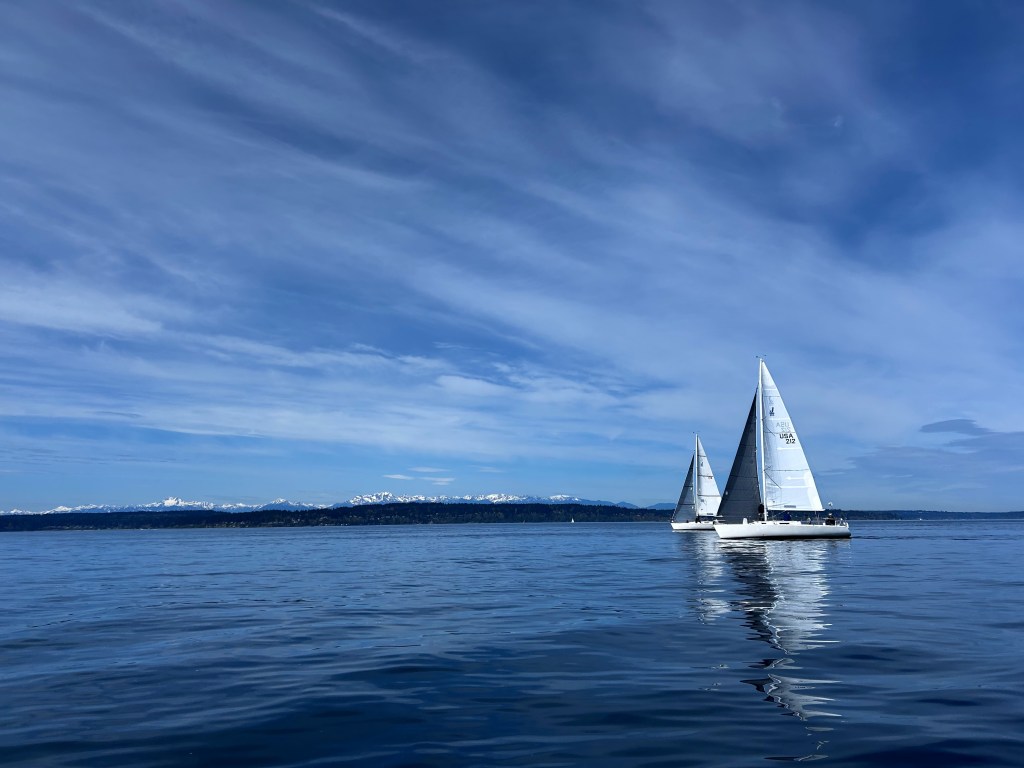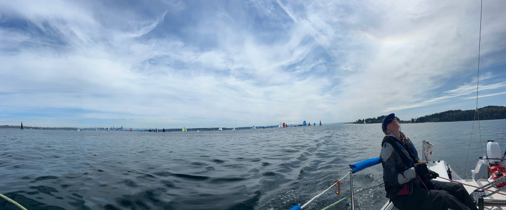 This is where it all went wrong for us. There were basically two routes back to Meadow Point. You could sail along the shore of Bainbridge in a narrow band of wind on the west side. There was a big flat spot in the middle of the sound, and you could go toward downtown Seattle and take the eastern side of the sound. Most of the fleet was going to the east side (Seattle). We went west because the wind looked pretty solid. There was a flat spot we had to cross, and then we thought we would be home free to make it the rest of the way to Meadow Point. We watched some boats make it across the dead spot, so we tried to do the same. It didn’t work. We got about halfway across and the wind completely died. Zero knots of breeze. We came to a complete stop and watched all the boats on the east side sail past us. We were well and truly stuck. To say it was frustrating is an epic understatement. We could see wind on the water about 300 yards away. So tantalizingly close!