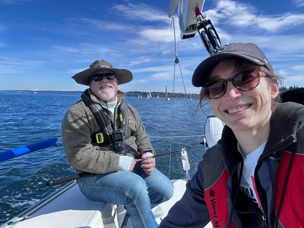 I love a good light air race. The speeds and the forces are low, and the strategy is tough. Light air sailing takes a combination of patience and focus that just suits me well. However, there’s light air and then sometimes there’s no air. That’s how I would characterize this regatta. The race course was a patchwork of wind holes and gentle zephyrs. One minute, you are a genius: gliding along in your own private breeze. The next minute, you are an idiot: trapped in a windless hole watching the rest of the fleet sail around you. It was hard to make all the right moves. The good news was that it was an absolutely stunning day on the water. Both the mountains were out. Seventy degrees and flat out gorgeous!