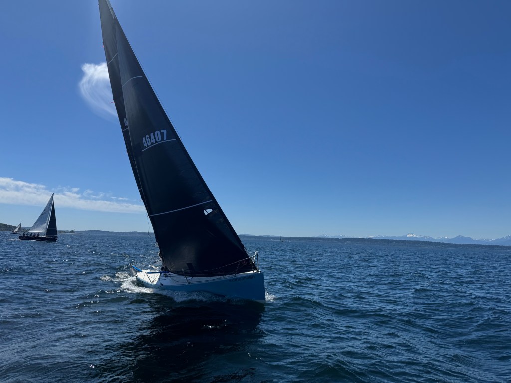 After the rounding, we had a few minor hiccups getting the spinnaker up, but we managed—and just in time to hit a bit of a wind hole. Thankfully, the entire fleet got stuck there too. We were lucky and managed to punch out of it quickly, heading back toward the center of the Sound. What followed was one of the most glorious spinnaker runs I’ve ever experienced. The reach back to West Point was fast, steady, and exhilarating. At one point, we hit 9.5 knots—far beyond what I expected on such a mild, sunny day. The whole run was smooth, with no need to jibe. We just flew downwind with Rainier beckoning on the horizon.