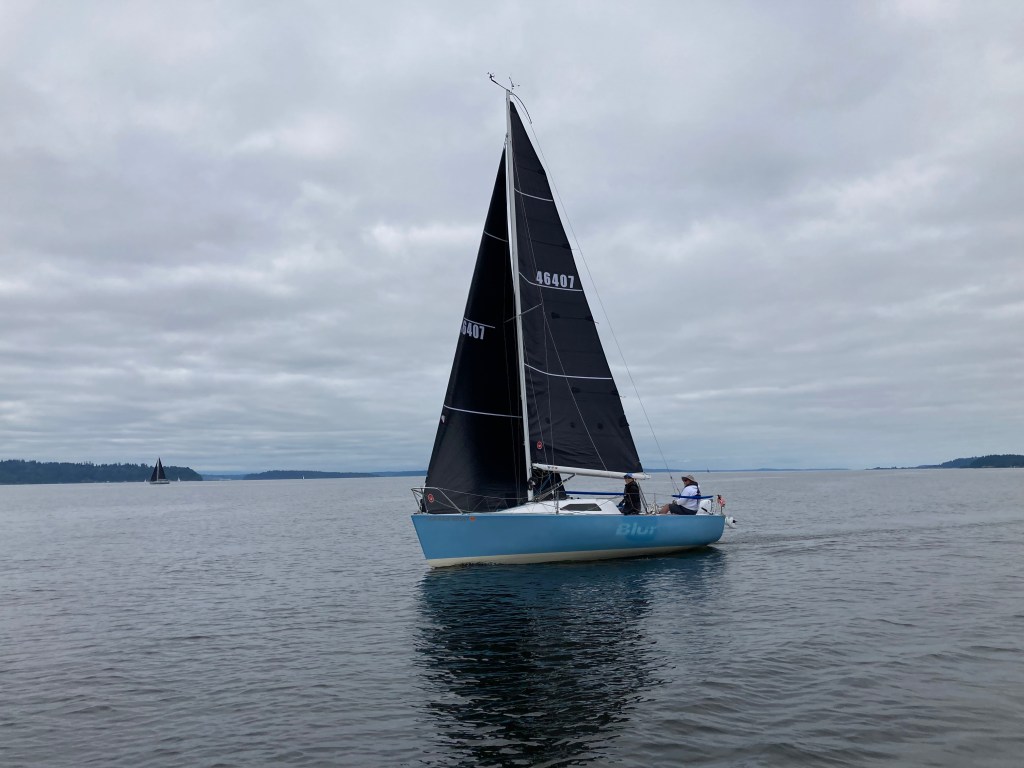 Saturday morning started off cool and cloudy, with a layer of fog out on the sound at Shilshole. The wind was light, drifting between 3 and 5 knots from the south. After our recent trend of warm weather, this change caught a lot of folks off guard. Down the Sound is held during the slow, balmy late summer. Typically, you can expect to bob around in little to no wind and bake under blazing sunshine. Not this time. As my crew, Laura Lewis, and I prepped Blur for the race, we found ourselves pulling on extra layers and telling each other, “It’ll all burn off by lunchtime.”