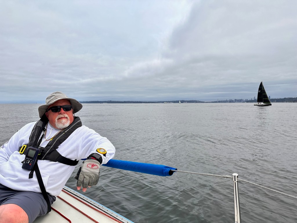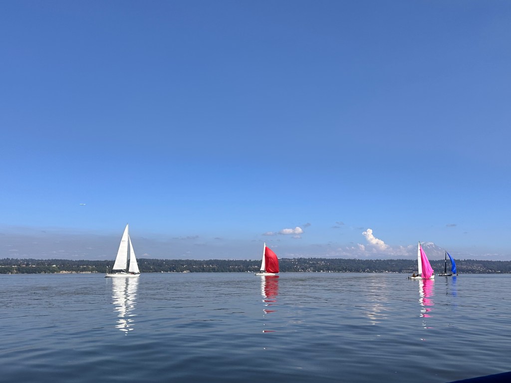 The good news—unexpected really, given the gloomy forecast—was there was a decent carpet of wind as far as the eye could see. The breeze fluctuated, and there were occasional holes here and there, but on average it was better than previous years. Blue Jeans was doing an extraordinary job and used their first start to their best advantage. They were just a dot on the horizon. We had Yeah Dogg, Moore Pun, and Perfectly Strange in a group about a quarter mile ahead of us. It seemed like a lot of ground to make up against some very good sailors. As we sailed south across Elliott Bay toward Blake Island, we took a conservative approach in the relatively light breeze. No tacking or maneuvering unless there was a compelling reason—just keep moving.