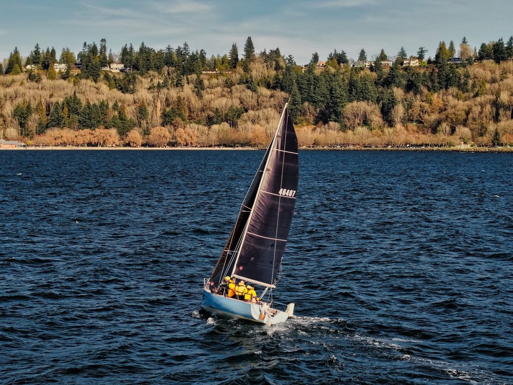 When they finally got around to starting us, the fleet was already halfway to the first mark in Edmonds. We got a bit of a late start on Blur. We saw some of our favorite competition Sabotage, Zephyr, Gaucho, Outlaw and others strike northward. Windward isn’t Blur’s favorite mode, so we took up the tail end Charlie position and waited for our chance to pounce at the windward mark. The wind continued to increase as forecasted and by the time we reached the windward mark, it was somewhere around 20 knots with the occasional puff to 25. As we rounded the windward mark, the man overboard alert sounded. We anxiously listened to the VHF and scanned the horizon for boats dropping spinnakers. I’m not quite sure what happened, but after a couple of alerts, they signaled that it was a false alarm. We popped the chute, firmly in last place.